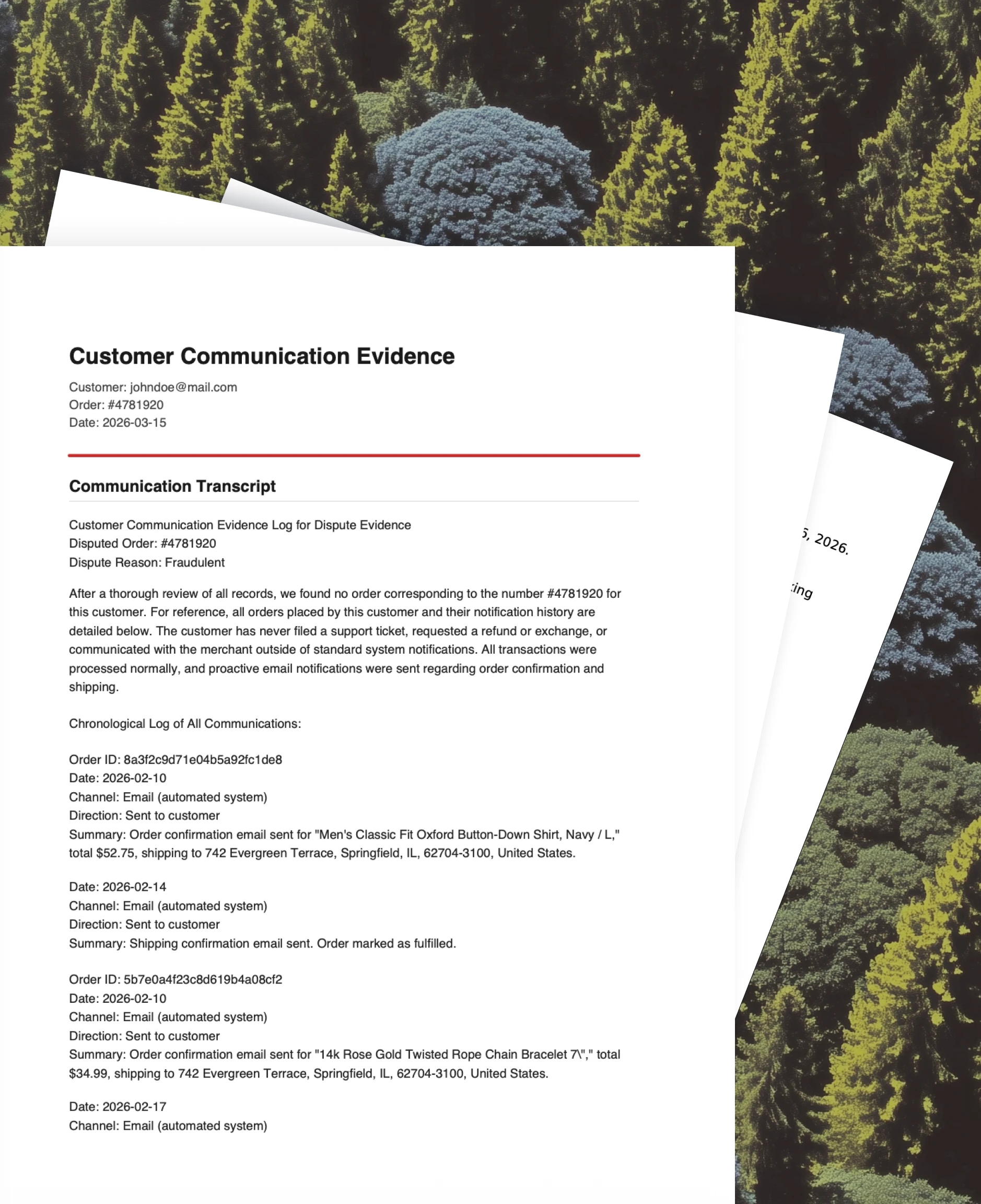 Reclaim pulls order details, tracking info, and customer communications from across your platform, website, policies and Redo products to automatically compile compelling evidence packages for every dispute.