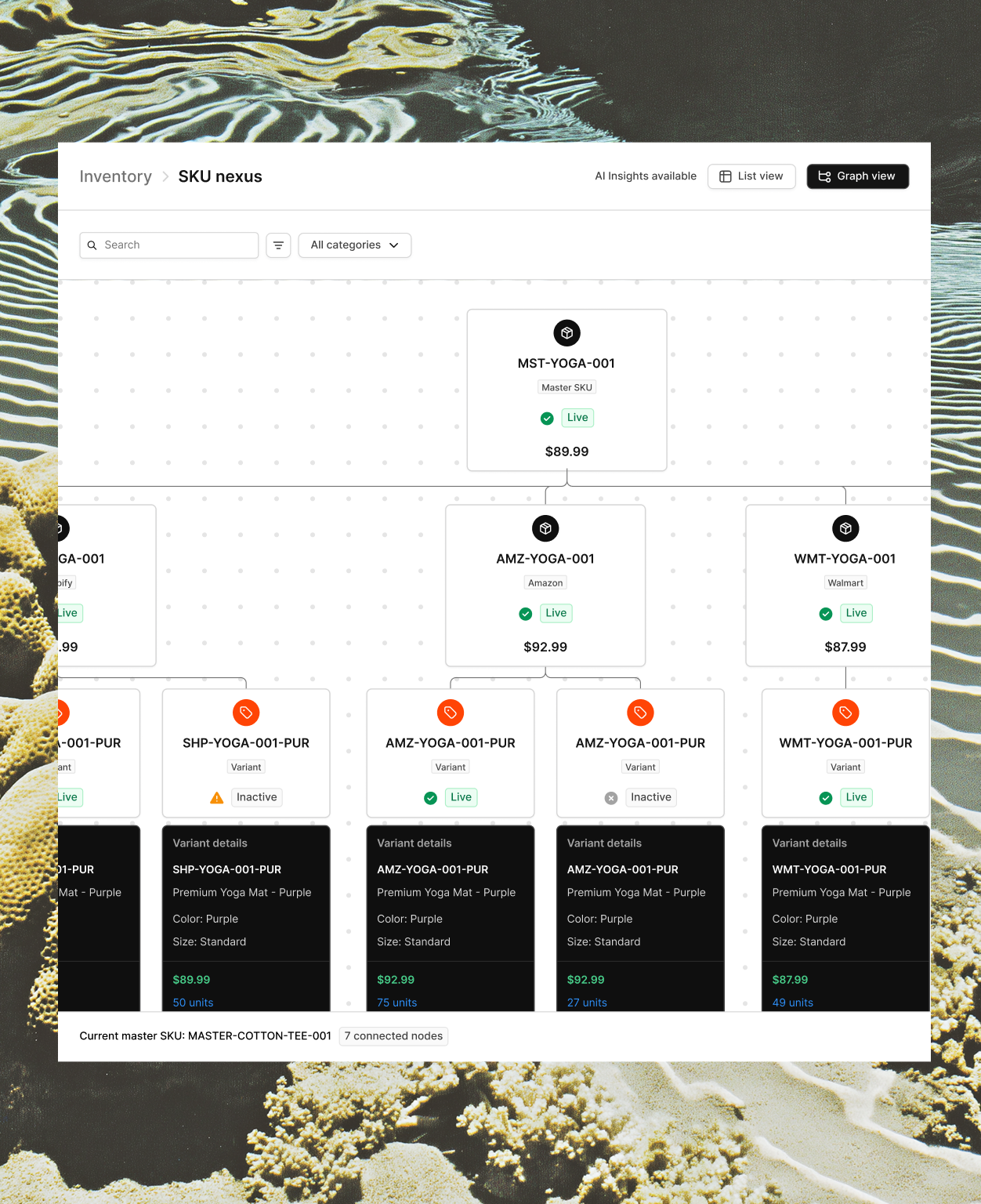Map and manage every master SKU’s relationships—variants, bundles, and channel listings—in one unified view. Powered by AI, instantly detect shared attributes, unique differences, and predict the downstream impact of changes to any SKU across every channel.