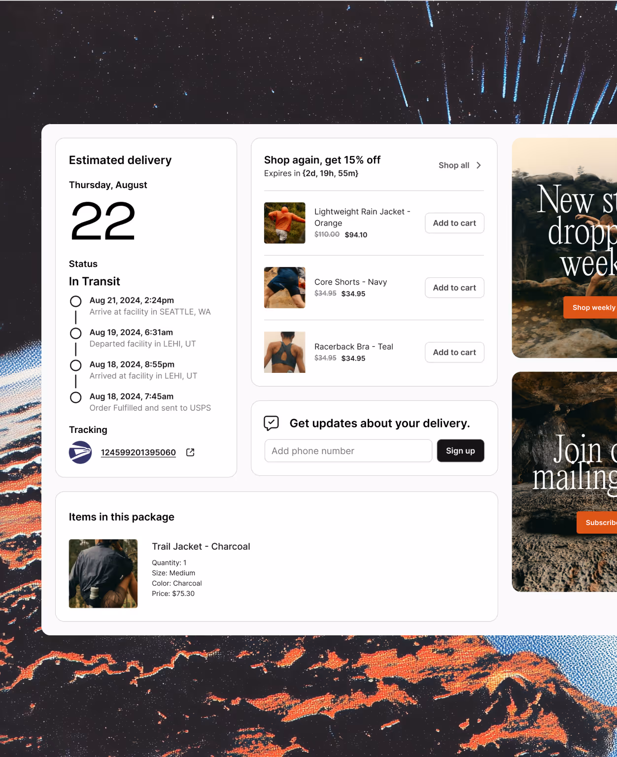 Create beautifully branded transactional emails and an order tracking landing page in minutes with an intuitive builder. Within 30 minutes, start sending custom transactional emails and pushing buyers to a tailored landing page.