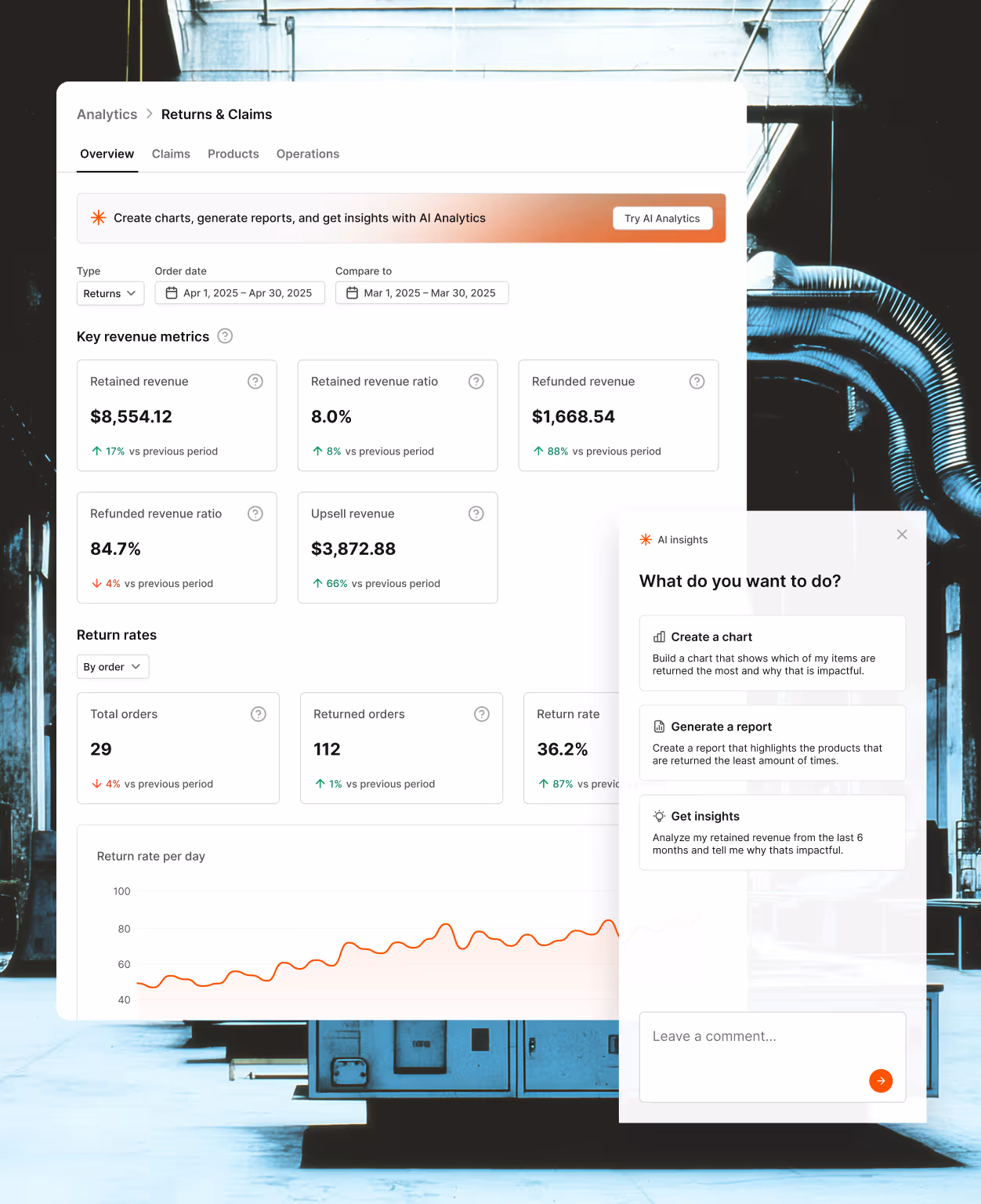 On the merchant side, return reasons are surfaced in the Returns analytics dashboard grouped by product, category, and return type, making it easy to spot which SKUs generate the most fit complaints or quality issues without manually reviewing individual submissions. The AI analytics chat feature also lets merchants ask plain-language questions about their return data and receive instant trend summaries, so teams can act on insights without building custom reports. For brands managing large SKU catalogs or seasonal assortments, having accurate, AI-powered return reason data helps identify product improvements, optimize exchange recommendations, and reduce long-term return rates by addressing root causes at the source.