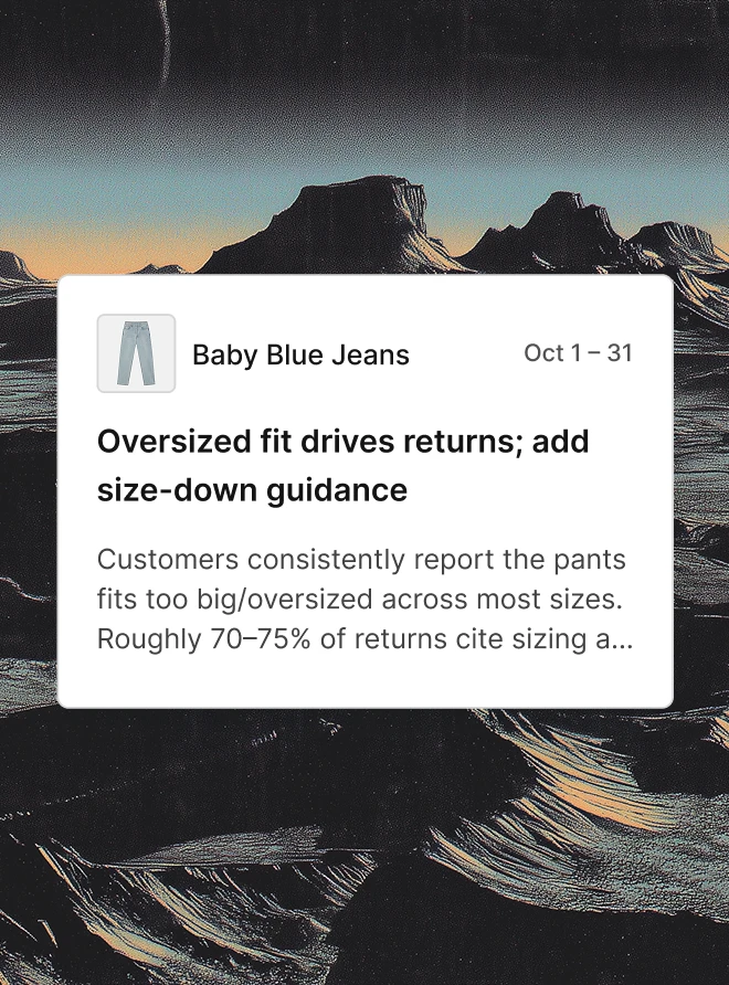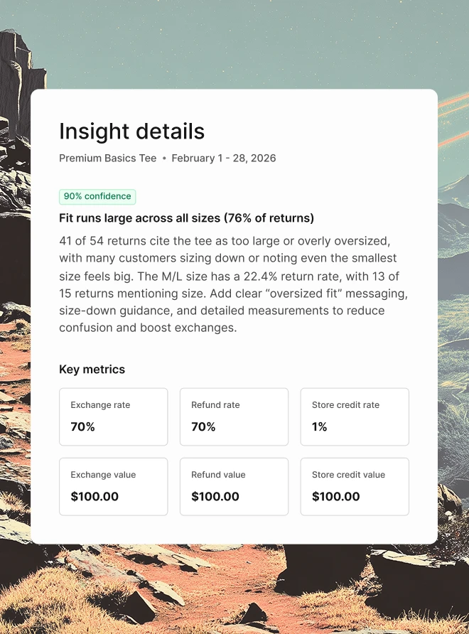 Redo's AI surfaces insights automatically inside the dashboard rather than waiting for you to ask the right question. It tracks what merchants search for and which suggestions are acted on to get smarter over time.